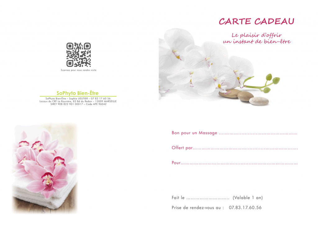 SoPhyto Bien-Être SOPHIE LIEUTIER MASSAGES BIEN ETRE / CONSEIL EN PHYTO-AROMATHERAPIE Choisissez le massage qu'il vous faut MASSAGES Dos - Epaules - Nuque Suédois (sportifs) Japonais du Visage Ayurvédique Remodelant Tonique Drainage Lymphatique Californien (adapté futures mamans et séniors) REFLEXOLOGIE Tarifs généraux: 1h00 : 60€, 1h30 : 90€… Pour tout renseignement et réservation : 07 83 17 60 56 CARTES CADEAUX Offrez un moment de Bien-Être à vos proches grâce aux Cartes Cadeaux CONTACT 07 83 17 60 56 contact@sophyto.fr Facebook MARSEILLE Horaires d'OuvertureLundi, mardi et mercredi après-midiJeudi matin Centre Commercial La RouvièreNiveau rez-de-jardin (dans le CRF Kiné)83 bd du Redon13009 MARSEILLE St MAXIMIN Horaires d'OuvertureVendredi toute la journée Espace médical de La tour391 Avenue Maréchal Foch83470 Saint-Maximin-la-Sainte-Baume